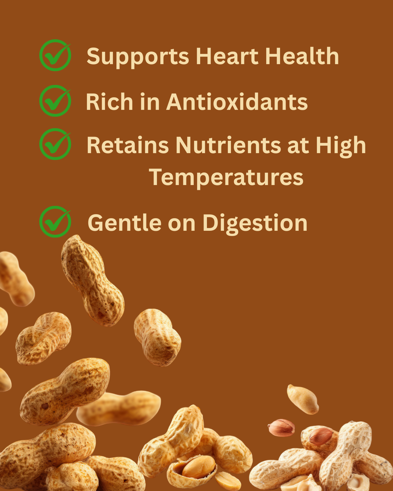 This oil is rich in antioxidants like resveratrol and vitamin E. By clearing the body of free radicals; antioxidants reduce oxidative stress and inflammation. Cold pressed groundnut oil consumption may promote healthier cells and tissues.